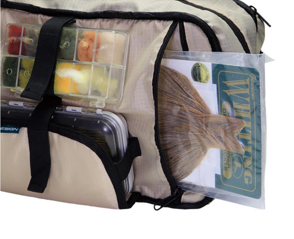 - Horizontal pockets keep long materials such as hackle capes