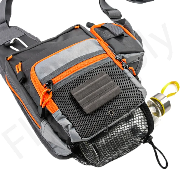 The strategically placed bottle holder (no bottle included) is accessible without having to turn the sling. There are a number of cord loops on the sling where things like a tippet holder can be attached. Various interior pockets and dividers help you to organize the contents of the bag.