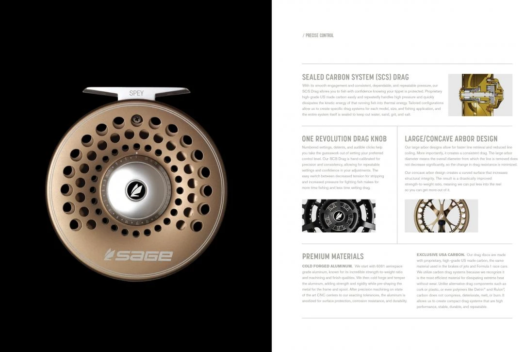 The Sage Spey Fly Reel combines classic aesthetics with modern performance. The Sage Spey Fly Reel introduces a reel designed for the angler looking for a reel that addresses the nuances of Spey fishing. Heavier to better balance longer rods and increased capacity to hold larger Spey lines, the Sage Spey Fly Reel features full line guards to assure thin running lines do not migrate between the spool and frame during dynamic casting motions. A romantic appeal to designs and colours that reflect the classic feel of old, yet packed with performance features that will assure you will never lose that fish of a lifetime.