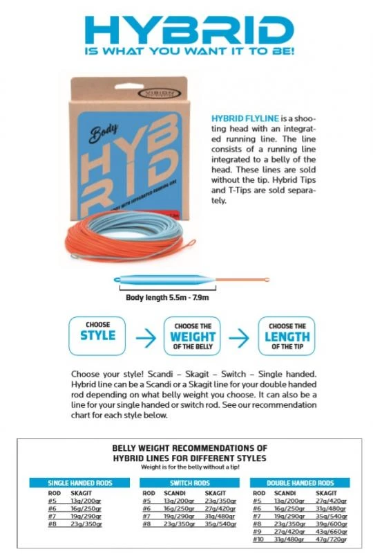 All Hybrid tips work with all Hybrid, Hammer, TNT, ACE Skagit and ACE Switch shooting heads. When choosing the tip, you only choose the length you desire and density. You do not have to think about the weight of the tip as Vision has done that for you.